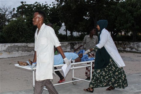 | Une femme, blessée dans l'attaque d'un hôtel, est transportée à l'hôpital Madina de Mogadiscio, le 16 août en Somalie. |