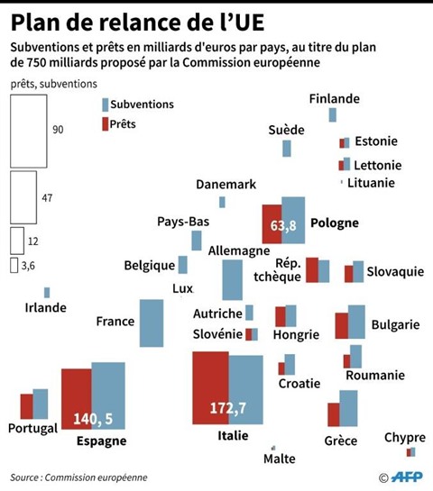 Sur la table des négociations : un plan de relance de 750 milliards d'euros, composé de 250 milliards de prêts, et surtout de subventions à hauteur de 500 milliards, qui n'auront pas à être remboursées par les États bénéficiaires.