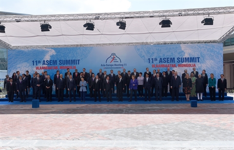 | Les dirigeants posent pour une photo lors du 11e sommet Europe-Asie à Oulan Bator en Mongolie, le 15 juillet 2016. |