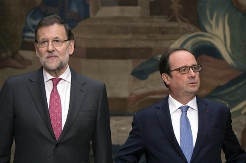 | Le chef du gouvernement espagnol Mariano Rajoy (gauche) reçu à l'Elysée par le président français François Hollande, le 1er décembre à Paris. |