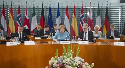 | La chancelière allemande Angela Merkel (au milieu) et les dirigeants de l’Union européenne lors de la conférence préparatoire pour le Sommet G20, à Berlin, le 29 juin. |