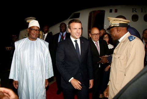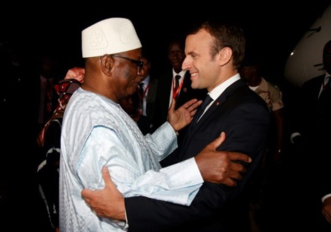 | Le président français Emmanuel Macron (droite) est accueilli par son homologue malien lIbrahim Boubacar Keïta, président en exercice du G5 Sahel à Bamako le 2 juillet. |