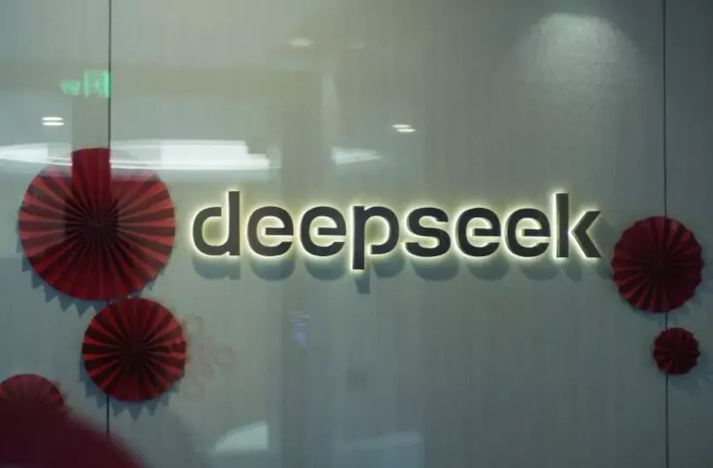 | Le logo de l'IA DeepSeek dans les bureaux de la start-up chinoise à Hangzhou, dans la province du Zhejiang, le 5 février. |