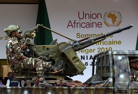 | Sécurité renforcée à Niamey qui accueille le sommet de l'Union africain (UA). Devant le Palais des Congrès le 4 juillet. |