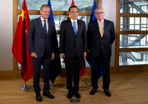 | Le président du Conseil européen Donald Tusk (gauche), le Premier ministre chinois Li Keqiang (centre) et le président de la Commission européenne Jean-Claude Juncker, le 2 juin à Bruxelles. |