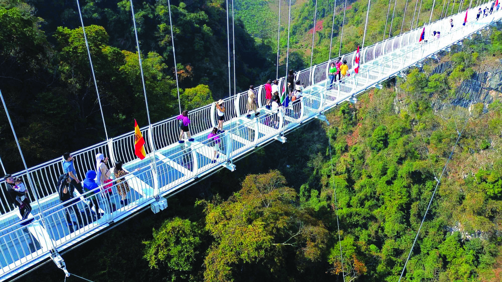 | Touristes visitant le pont en verre Bach Long dans le district de Môc Châu, province de Son La (Nord). |