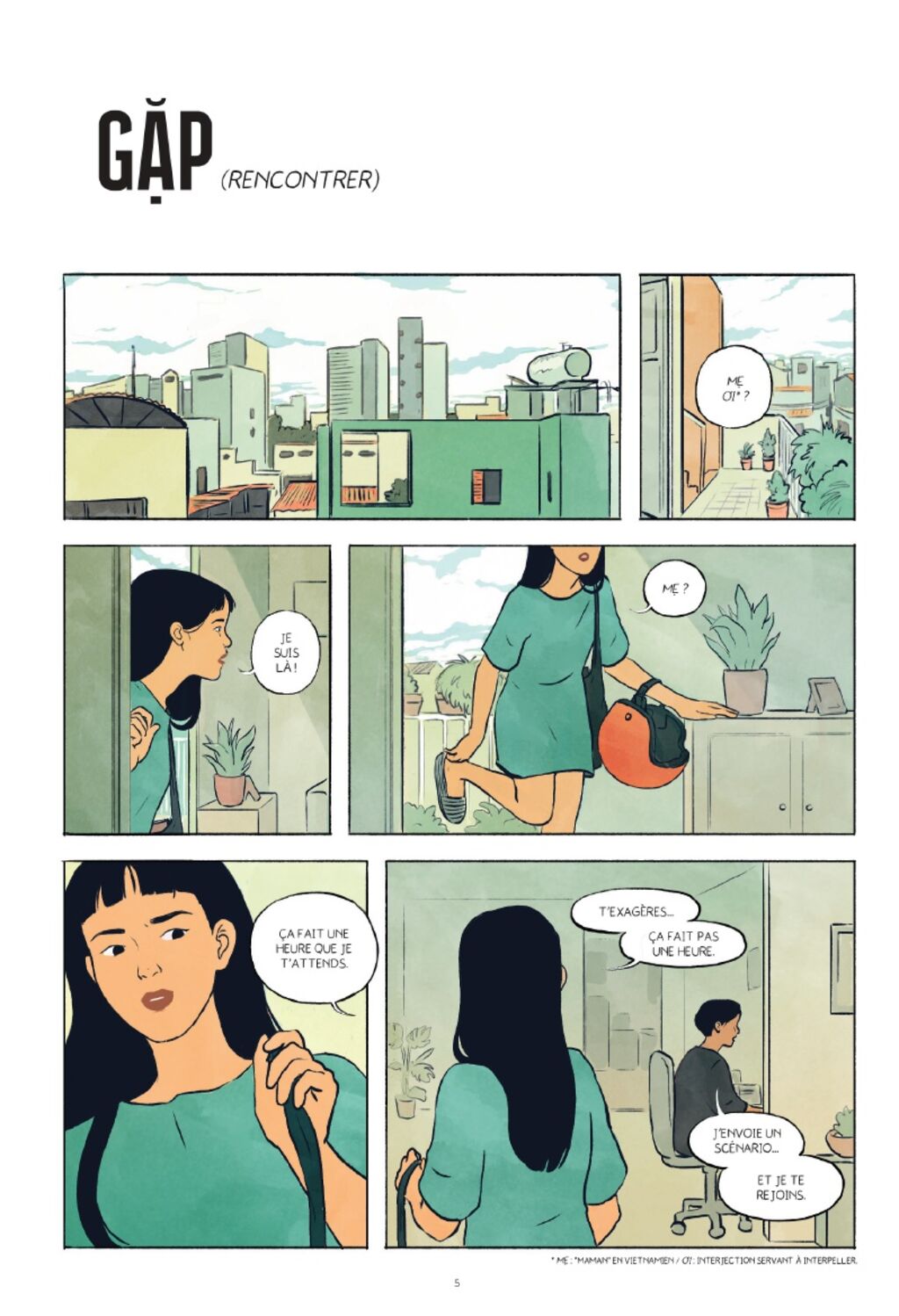 Une fois que le découpage a été validé par Hai Anh et les éditrices, Pauline a d’abord encré toutes ses planches, puis une fois l’encrage validé, elle est passée à la couleur. Elle a réalisé tout le travail numériquement, par habitude mais aussi pour gagner du temps. “Il était important pour moi de donner à ce roman graphique un titre dans ma langue maternelle et d’en conserver les accents. En vietnamien, +Sông+ signifie +vivant, en vie+, et c’est le mot qui me vient toujours à l’esprit lorsque ma mère me raconte ses aventures d’adolescente. Aussi singulières que puissent être ses histoires, je tenais à résumer chaque souvenir en un seul verbe vietnamien afin de les inscrire dans un thème plus universel”, répète souvent Hai Anh.