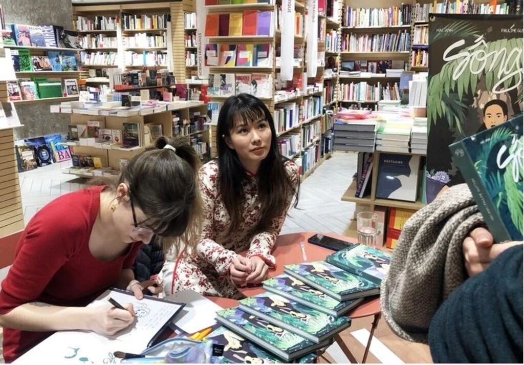 | Hai Anh (droite) et Pauline Guitton dédicacent leur ouvrage à des lecteurs en France. |