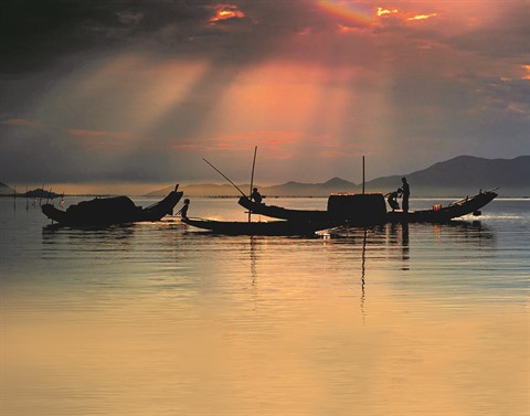 Le long de la rive, s’alignent les barques de pêche deux à deux.