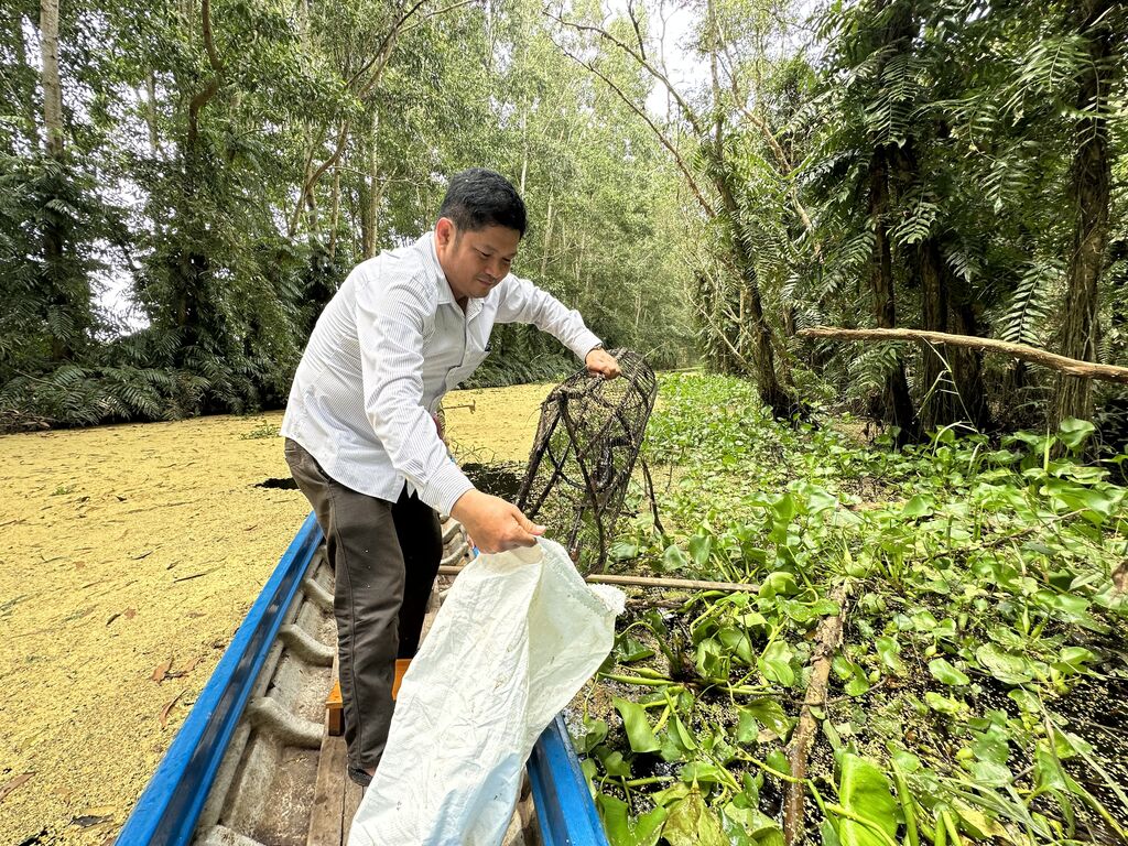 | Nguyên Hoàng Khoi pêche dans la forêt de melaleuca. |