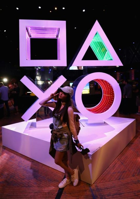 | Des joueurs et du personnel avant la présentation de nouveaux produits au salon E3 de Los Angeles, le 12 juin |