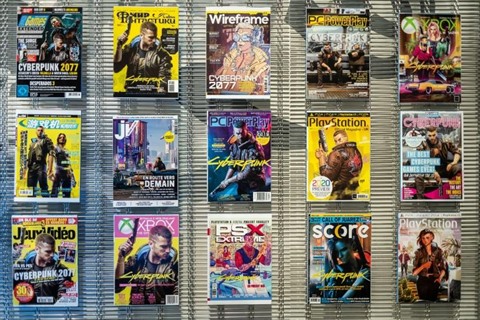| Des magazines titrant sur le jeu Cyberpunk 2077 exposés au siège du développeur de jeux vidéos polonais CD Project, le 4 décembre à Varsovie. |