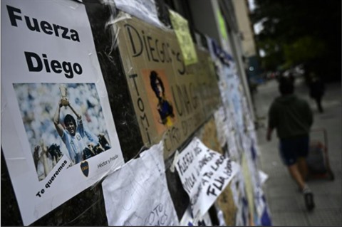| Quelques effigies et des messages d'encouragement ornent une façade de la clinique privée où a été admis Diego Maradona, le 9 novembre. |
