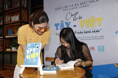 | Nuong Cheryl Dao (assise) dédicace son ouvrage à une lectrice lors d'une séance de présentation du livre à Hô Chi Minh-Ville. |