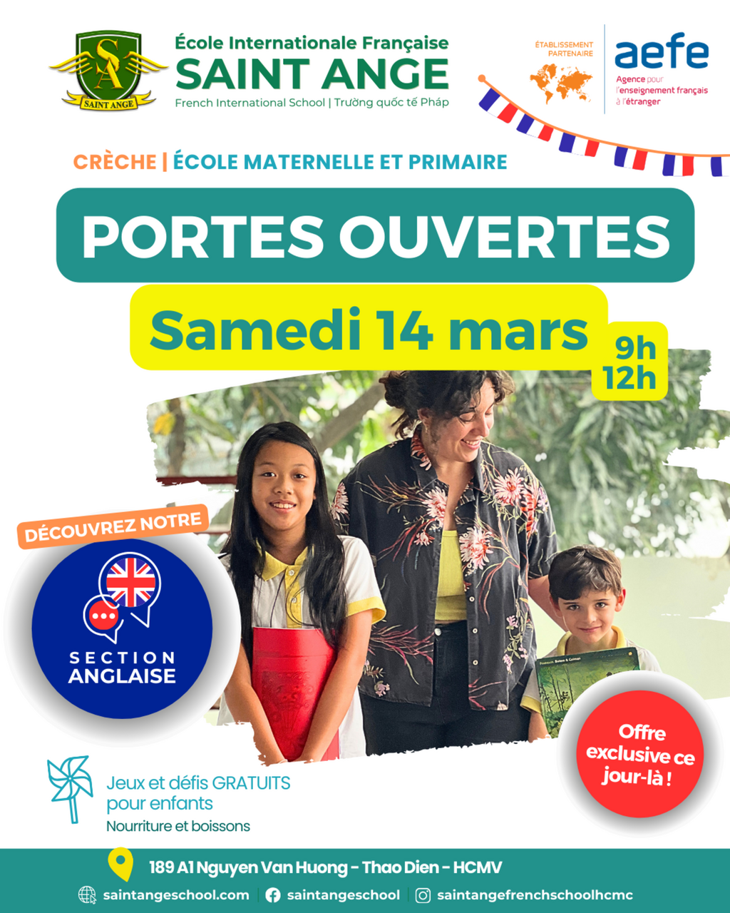 L’école internationale française Saint-Ange organise une matinée Portes Ouvertes le samedi 14 mars, de 09h00 à 12h00, à An Khánh (Thao Diên). L’établissement, qui accueille les enfants de 1 à 11 ans (de la crèche au CM2), présentera son modèle pédagogique axé sur l’excellence du programme français et une pratique renforcée de l’anglais à travers sa section anglaise.L’école se distingue par un encadrement à taille humaine, incluant au moins une assistante francophone par classe pour assurer un suivi individualisé de chaque élève. Outre la visite des locaux et la rencontre avec l’équipe enseignante, une offre exclusive sur les frais d’inscription sera réservée aux familles présentes ce jour-là. Des activités gratuites sont aussi proposées aux enfants : lecture illustrée “Kamishibai”, basketball, tir à l’arc, et un spectacle de Bulles pour finir.