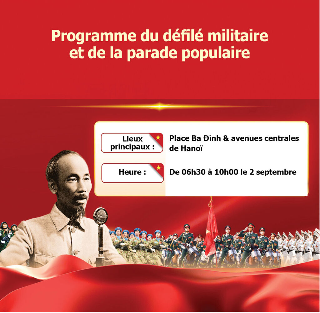 Le matin du 2 septembre, sur la place historique Ba Đình à Hanoï se tiendront solennellement le défilé militaire et la parade populaire célébrant le 80ᵉ anniversaire de la Fête nationale de la République socialiste du Vietnam. L’événement débutera à 06h30 et se terminera à 10h00.