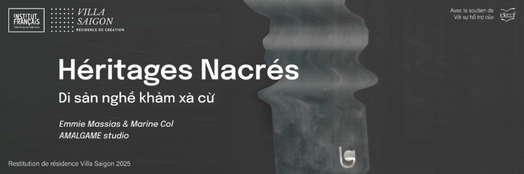 L’exposition “Héritages nacrés”, d’Emmie Mai Linh Massias et Marine Col, explore la tradition vietnamienne de la marqueterie de nacre dans le mobilier, en combinant savoir-faire ancestral et production industrielle locale. En intégrant la nacre à des matériaux issus de l’artisanat et de l’industrie, le duo revisite cet artisanat marqué par l’influence coloniale française, tout en mettant en avant son identité vietnamienne.
