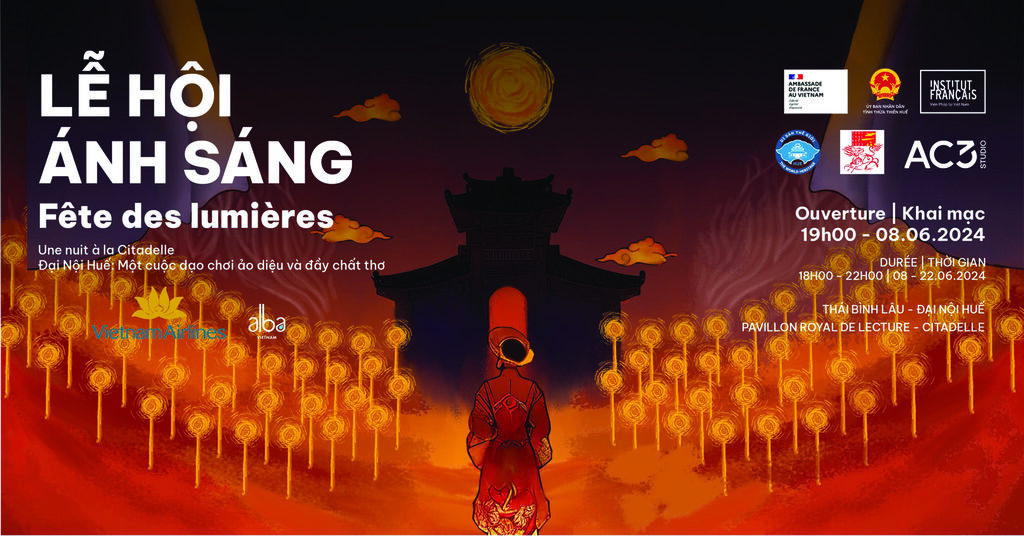 Suite au succès de l’événement Huế by light - The live show, l’ambassade de France au Vietnam, l’Institut français du Vietnam et le Comité populaire de la province de Thua Thiên Huê ont le grand plaisir de vous présenter “Fête des lumières”, un parcours de nuit, au sein de la Citadelle impériale de Huê, où sont installées douze œuvres lumineuses et sonores. À mi-chemin entre exposition d’art numérique et balade onirique, les visiteurs sont invités à (re)découvrir le Pavillon royal de lecture et ses jardins.