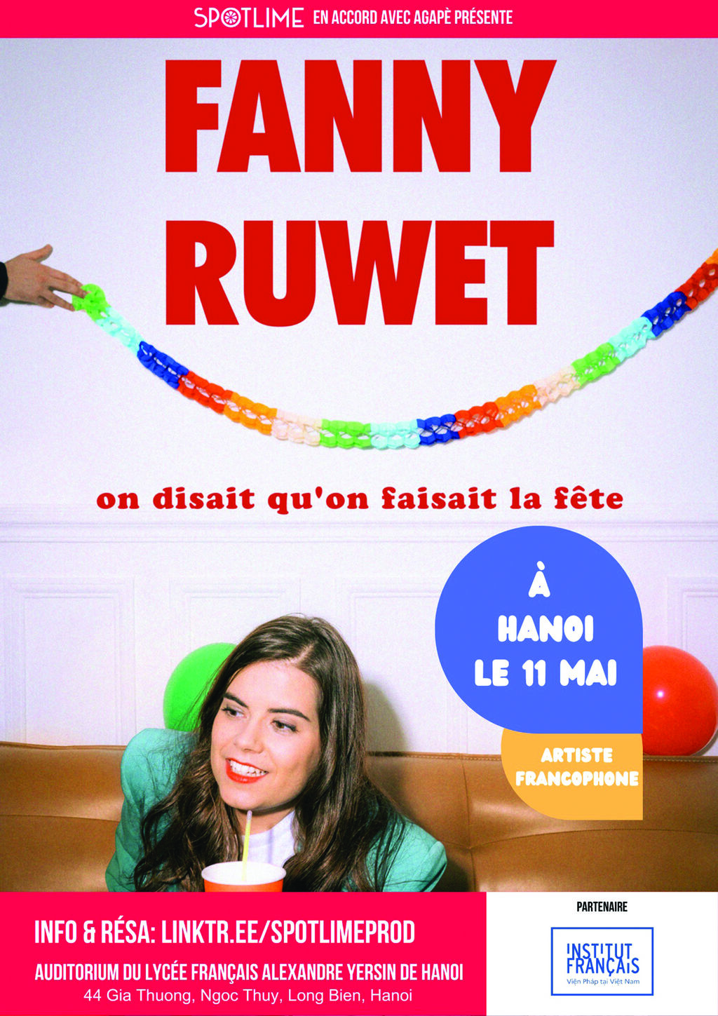Dans le cadre de la promotion de la francophonie et des arts de la scène, l’Institut français du Vietnam, en partenariat avec Spotlime, accueille l’humoriste Fanny RUWET, samedi 11 mai à 20h00, dans l’auditorium du lycée français Alexandre Yersin, pour son nouveau spectacle On disait qu’on faisait la fête.