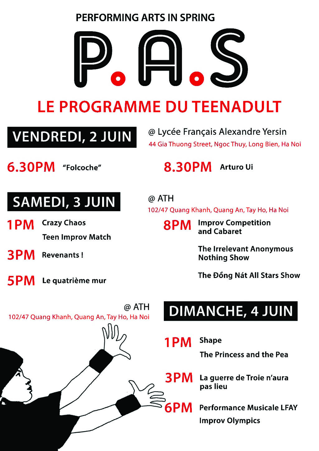 C’est l’Atelier Théâtre et Arts de Hanoï (ATH), en collaboration avec le lycée français Alexandre Yersin et, avec le soutien de l’ambassade de France au Vietnam, qui relance le festival des arts de la scène, nommé ‘‘P.A.S”, créé en mai 2015. Au programme, du 27 au 28 mai, puis du 2 au 4 juin, découvrez des spectacles gratuits d’improvisation, de théâtre, de musique, de danse, etc… en anglais, en français et en vietnamien…