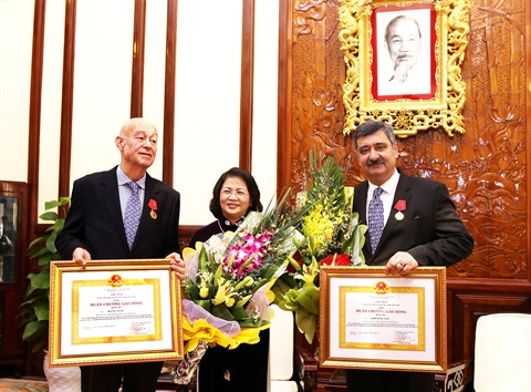 | La vice-présidente Dang Thi Ngoc Thinh remet l'Ordre du travail de 3e classe de l'État vietnamien aux deux présidents de SOS Villages d'enfants international, le 22 décembre à Hanoï. |