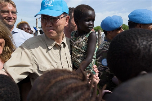 | Le secrétaire général de l'ONU, Ban Ki-moon, en mission au Soudan du Sud le 7 mai. |