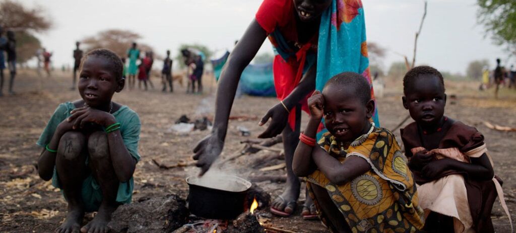 | Une femme prépare un repas avec ses trois enfants à Thanyang, au Soudan du Sud. |
