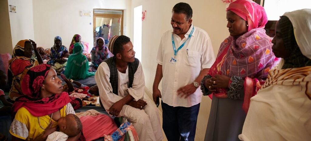 | Un médecin parle à une famille dans un établissement de santé au Soudan. |