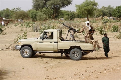| Un convoi des forces de sécurité soudanaises déployé à al-Geneina, capitale du Darfour-Ouest, le 2 avril 2016. |