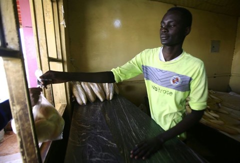 | Un Soudanais tend un sac contenant du pain, dans une boulangerie de Khartoum, le 5 janvier. |