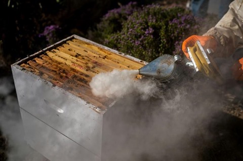 | Un travailleur social utilise de la fumée pour endormir les abeilles d'une ruche de la ferme agricole "La Caserma des herbes". |
