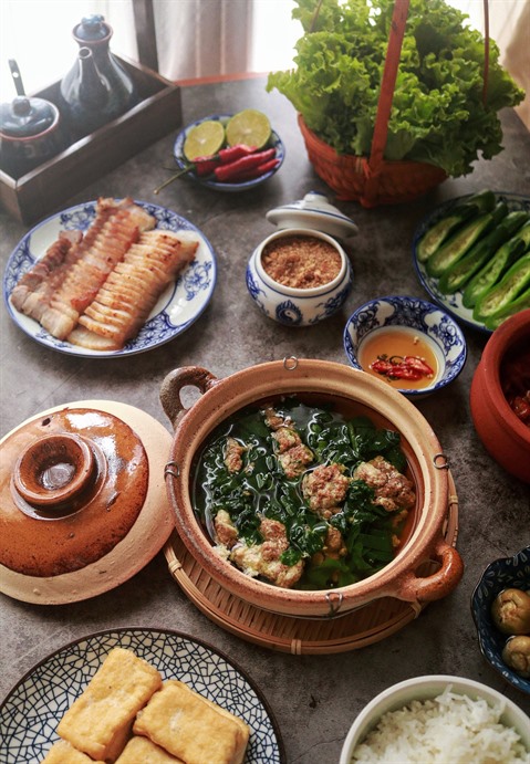 La soupe au crabe d'eau douce avec de la baselle est mangée avec du tofu frit et des fruits de morelle (Solanum macrocarpon) salés. Le tout crée un repas populaire apprécié des Vietnamiens, notamment en été.