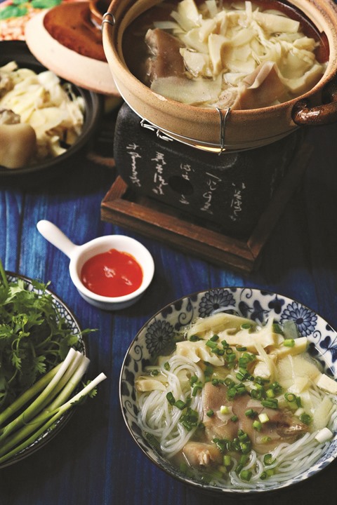 - Nettoyer les côtes et les pieds de porc, les faire bouillir pendant 5 minutes puis les nettoyer à nouveau. Ajouter une cuillère à soupe de nuoc mam puis faire sauter dans une grande casserole. Y verser deux litres d’eau et laisser mijoter à feu moyen.