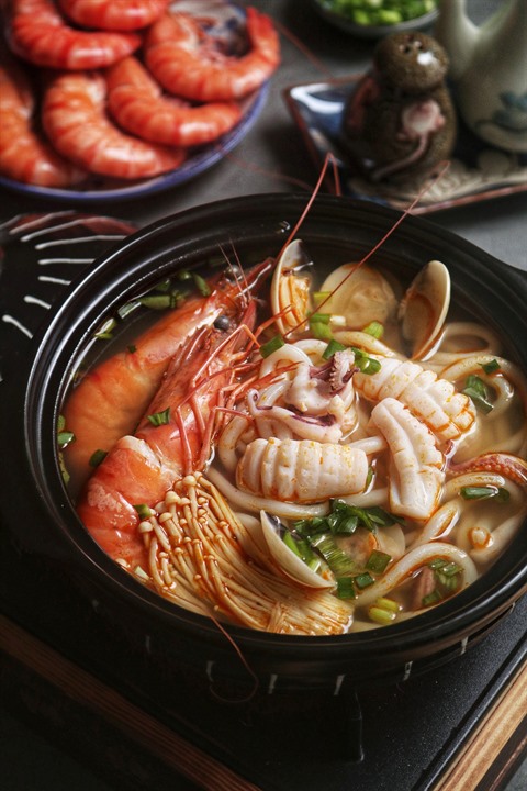 - Nettoyer les crevettes, le calmar et les meretrix. Décortiquer les crevettes. Couper le calmar en morceaux. Les faire mariner avec un peu de sel et de poivre pendant environ 20 minutes.