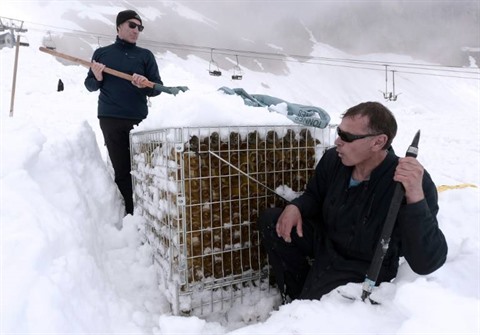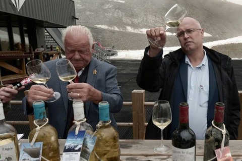 "On a eu du mal à déneiger, il y en avait trois, quatre mètres et de la glace. La dameuse est passée et on a fini à la main. Après cinq mois sous la neige, on devrait déjà voir des différences", espère le vigneron bordeleais Franck Labeyrie, fort de ces précédents essais en mer et dans une mine belge.