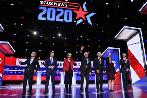 | Les candidats aux primaires démocrates sur le plateau d'un débat à Charleston, en Caroline du Sud, le 25 février. |