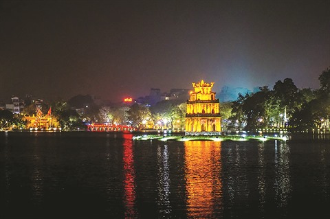 | Feux d'artifice tirés au lac Hoàn Kiêm, à Hanoï, lors du Réveillon. |