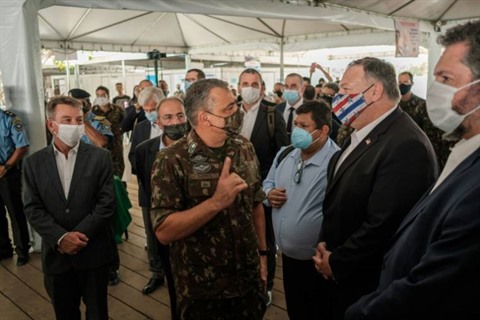| Le secrétaire d'État américain, Mike Pompeo, le 18 septembre à Boa Vista au Brésil, où il s'est rendu dans un centre d'aide des réfugiés vénézuéliens. |