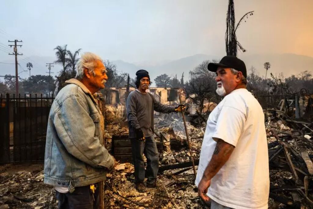 | Des résidents constatent les ruines de la maison de l'un d'entre eux détruite par les incendies violents à Altadena, près de Los Angeles (Californie), aux États-Unis, le 9 janvier. |