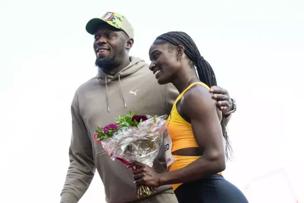 | La légende du sprint Usain Bolt aux côtés de la sprinteuse de Sainte-Lucie Julien Alfred après sa victoire sur le 100 m au meeting d'Oslo le 12 juin. |