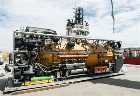 | Un véhicule de recherche sous-marine affrété par la Marine américaine attend d'être embarqué sur un navire, le 24 novembre 2017 à Comodoro Rivadavia. |