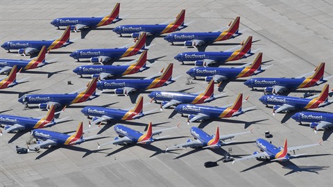| Des Boeing 737 MAX de Southwest Airlines sur le tarmac de l'aéroport de Victorville, le 28 mars 2019 en Californie. |