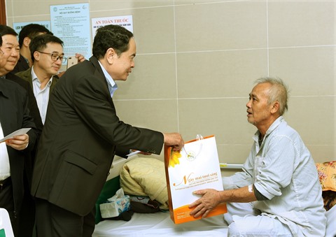 | Le président du Comité central du Front de la Patrie du Vietnam, Trân Thanh Mân, offre le cadeau à un patients cancéreux à l'hôpital Bach Mai. |