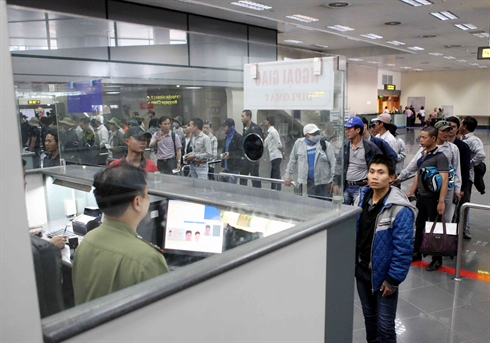 | Des travailleurs vietnamiens présents à l'aéroport de Nôi Bài, à Hanoi. |