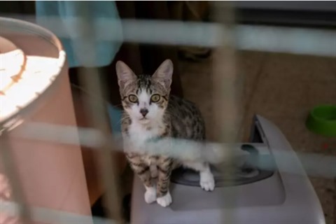 | Un chat abandonné dans un refuge de la SPA à Chamarande, le 29 juillet 2021. |