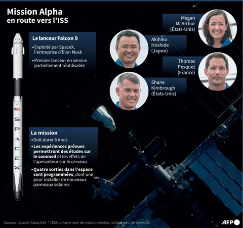 En plus de Thomas Pesquet pour l'agence spatiale européenne (ESA), la mission baptisée Crew-2 comprend deux astronautes américains, Shane Kimbrough et Megan McArthur, et le Japonais Akihiko Hoshide.