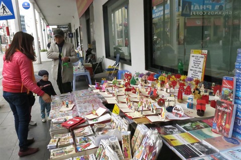 | Des livres et articles artisanaux sont mis en vente sur le trottoir dans une rue hanoïenne. |