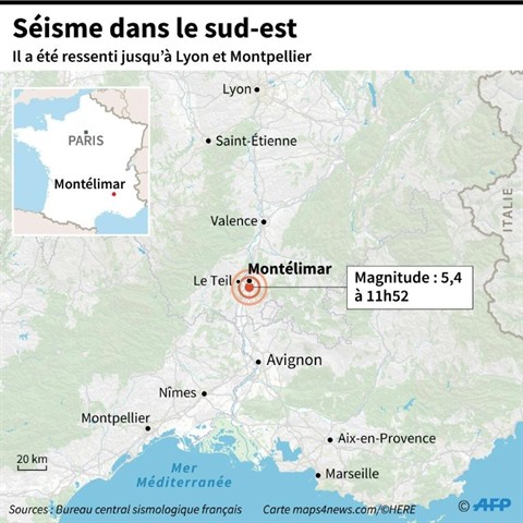 Il a principalement frappé la Drôme et l'Ardèche, notamment Montélimar où une personne a été grièvement blessée dans la chute d'un échafaudage, selon la préfecture de la Drôme. Trois autres personnes ont été légèrement blessées en Ardèche "suite à une crise de panique", a indiqué sur Twitter le préfet de ce département. La secousse a été ressentie jusqu'à Saint-Étienne, Grenoble, Lyon, et même dans le sud de la France, mais c'est au Teil, localité limitrophe de Montélimar de plus de 8.500 habitants, que le séisme a fait le plus de dégâts matériels.