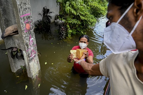 | Des militaires distribuent de la nourriture aux habitants victimes des inondations à Kelaniya au Sri Lanka le 6 juin. |