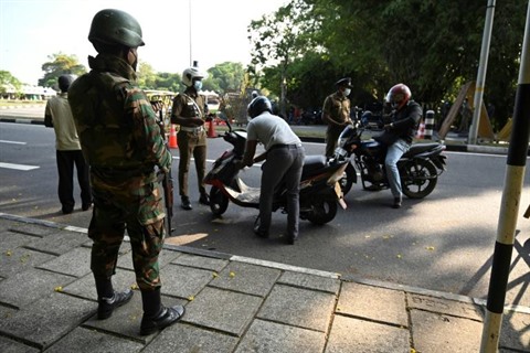 | Un militaire monte la garde à un contrôle dans une rue de Colombo, le 3 avril. |